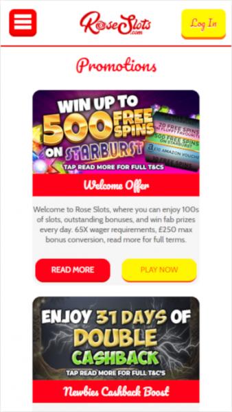 In-terms of looks; Rose Slots Casino features a classic slots theme with a splash of red completing the effect. Navigation is very intuitive, and the casino plays very well on smartphones and tablets so you can take the casino action anywhere with you.
