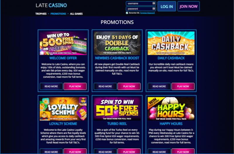 New players are treated well at Late Casino with a great welcome package of up to Free Spins or Amazon Vouchers (Full terms available through the links on this page), while there is plenty of reason for players to return as the casino has a range of reload bonuses such as Daily Cashback or Spin to Win. Players are looked after by the casino support team, who are available via Email or leave a message on the website.